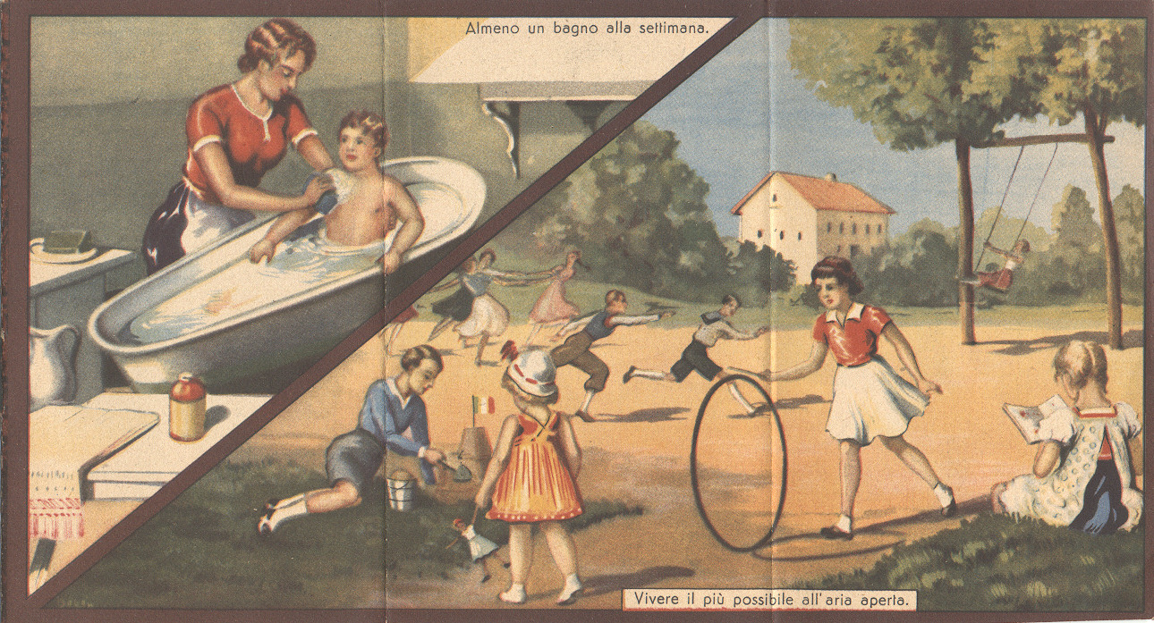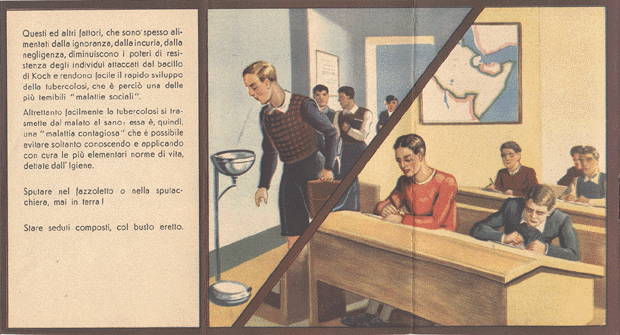 This pamphlet was produced by the Fascist goverment as part of a national campaign to combat tuberculosis. It includes a quote by Mussolini, saying that exposure to sun, fresh air, and outdoor exercise, were essential in fighting tuberculosis. The other pages show text and illustrations giving other advice on posture, proper places to spit, sleeping and eating well.
