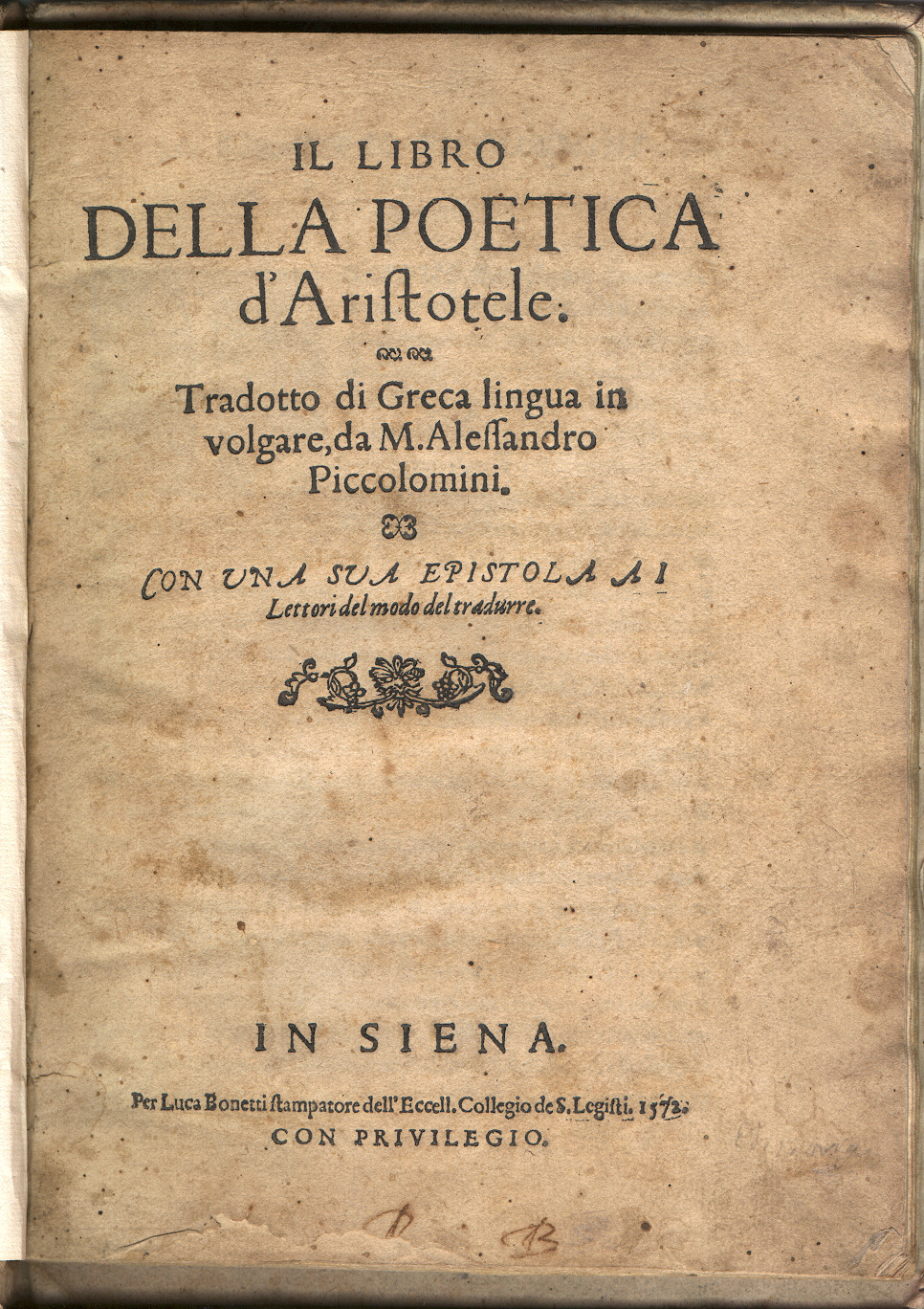 Another treasure recently uncovered is this 1572 edition of a translation of Aristotle's "First Book of Poetics" in the Italian vernacular by Alessandro Piccolomini (1508-1578). This Sienese humanist was one of the main protagonists who contributed to the great cultural movement of Classical Humanism during the Italian Renaissance, which brought back into circulation the philosophical and literary works of the Greeks. The fact that this translation is in the vernacular testifies to the great debate over which language best suited literary works: Greek, Latin, or the vernacular (actually a form of Tuscan dialect). The vernacular eventually won out with help from defenders like Piccolomini.