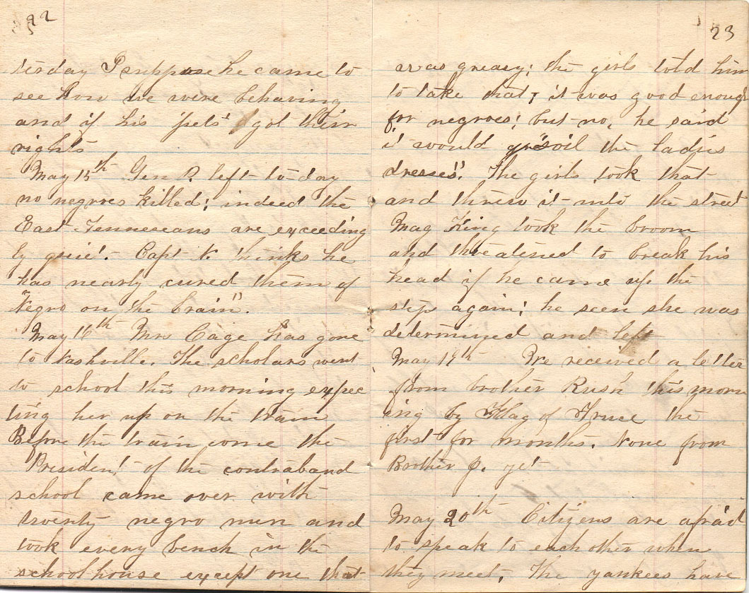May 16th Mrs. Cage has gone to Nashville. The scholars went to school this morning expecting her up on the train Before the train come the President of the contraband school came over with twenty negro men and took every bench in the school house except one that